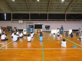 コロナ感染症予防のため、体育館でソーシャルディスタンスをとって行いました。
