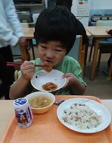 豚としめじのチャーハン、からあげです。みんなニコニコ笑顔で食も進みました。