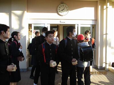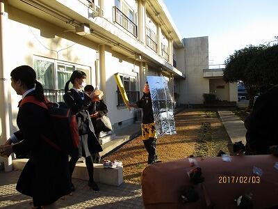 生徒玄関で、豆を準備しみんなが探していると・・・