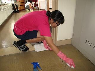 廊下の床磨きや窓掃除など、汗だくになって頑張りました。