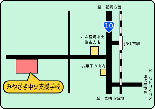 | 宮崎県立 みやざき中央支援学校 〒880-0121 宮崎県宮崎市大字島之内2100番地 TEL 0985-39-1633 FAX 0985-39-6046 |