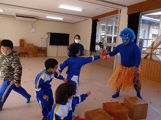 今年は節分が暦の並びで日曜日になったため、3,4年生は2月1日(金)に行いました。まず、節分にちなんだ本や紙芝居の読み聞かせを聞いた後、心の中にいる追いだしたい鬼を一人一人発表しました。発表した追いだしたい鬼を段ボール鬼に貼り付けて、「鬼を追いだそう!」と豆に見立てた新聞玉をみんなで投げて豆まきをしました。「おには~そと!」「おには~そと!」と勢いよく新聞玉を投げているところに、まさかの寄宿舎の先生扮する鬼が登場!!!こどもたちはびっくり!!!「本当に〇〇〇を追いだせるか?約束できるか!?」と迫力ある鬼の怒声に、どのこどもたちも「はい、約束します!」と即答していました。最後は鬼と仲良く記念写真をとり、鬼を見送りました。