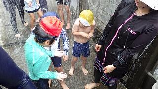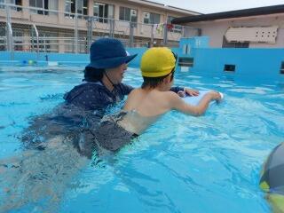 小学部3年生は、2年生と一緒に水泳をしています。「水慣れ」では、それぞれ小プールと中プールに分かれて、足から徐々に自分のからだに水をかけていき、腰、胸の順で入水します。「ワニ」の姿勢で歩いたり、輪っかをくぐったりしながら、体を水中で浮かし、水に顔をつけるなど、たくさんの体験をしています。また、先生と一緒に、大プールで浮き輪などを用いて楽しく活動しています。