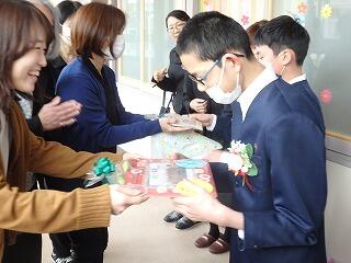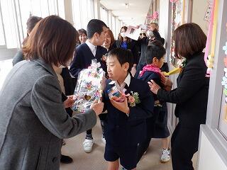 今年度の卒業式は全国的な感染症の流行を受けて規模縮小、時間短縮で式が行われました。卒業証書授与は壇上には上がらず、フロアでの授与で行われましたが、卒業生は6年間の成長がうかがえるような立派な姿で証書を受け取っていました。式が無事に終わった後に各学級に戻り、卒業プレゼントが職員から贈呈されました。このプレゼントは在校生が各学級で作成したものです。在校生から直接プレゼントを贈ることができませんでしたが、先生方からのお祝いの言葉とともに卒業生のもとに届きました。4月からのますますの成長を小学部のみんなで見守っています。ご卒業おめでとうございます。