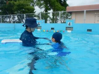 小学部3年生は、2年生と一緒に水泳をしています。「水慣れ」では、それぞれ小プールと中プールに分かれて、足から徐々に自分のからだに水をかけていき、腰、胸の順で入水します。「ワニ」の姿勢で歩いたり、輪っかをくぐったりしながら、体を水中で浮かし、水に顔をつけるなど、たくさんの体験をしています。また、先生と一緒に、大プールで浮き輪などを用いて楽しく活動しています。