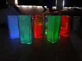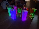 今年のみや央祭は、コロナ感染症拡大防止のため残念ながら中止になってしまいました。しかし、みや央ギャラリーは開催されるということで、小学部3年1組2組でランプシェイドを作りました。まず、牛乳パックの上の部分をはさみで切り、表面のプリントをはぎました。この作業がとても難しかったのですが、子供たちは根気強く取り組んでくれました。その後は、2色の絵の具を使ってマーブリングしたり、お花紙をちぎってはりつけたりして完成させました。完成後は、実際に部屋を暗くしてライトで照らすと、とても綺麗で子供たちはおおはしゃぎでした。同じ材料、同じ工程で作ったのにも関わらず、それぞれの個性が溢れるとても素敵な作品が完成しました。