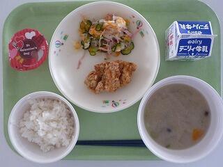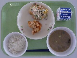 麦ご飯 鶏の唐揚げ 千切大根のサラダ なめこ汁 牛乳