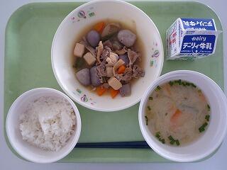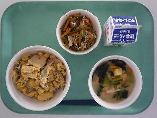 親子丼 おかか和え さつまいものみそ汁 牛乳