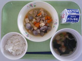 麦ご飯 鶏と里いものみそ煮 マロニースープ 牛乳