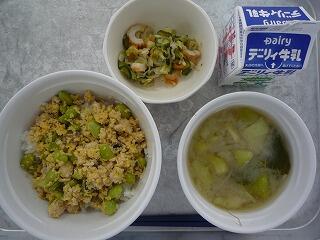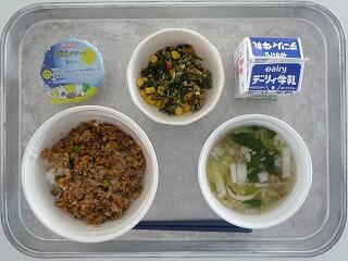 三色そぼろ丼 野菜の梅肉和え チンゲン菜のみそ汁 牛乳