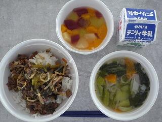麦ご飯 豚肉の柳川煮 ゆかり和え 牛乳