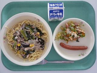わかめうどん 千草焼き ほうれん草サラダ 牛乳