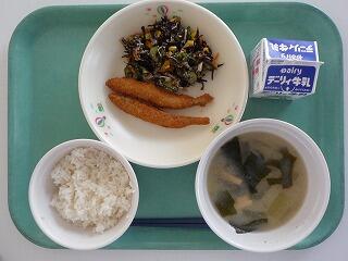 麦ご飯 ししゃもフライ ひじきサラダ 冬瓜のみそ汁 牛乳