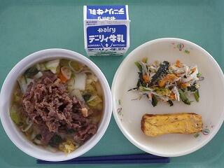 すき焼きうどん 鶏つくね ブロッコリーのごま和え 牛乳