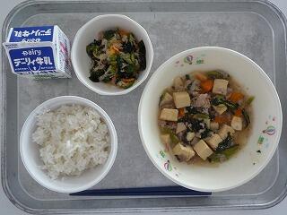 麦ご飯 厚揚げの中華煮 餃子スープ 牛乳