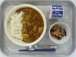 みやざき地頭鶏カレー 海藻サラダ 牛乳