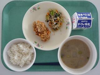 麦ご飯 鶏の唐揚げ ごま和え なめこ汁 牛乳