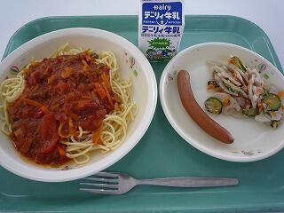 スパゲティトマトソース ウインナー れんこんサラダ 牛乳
