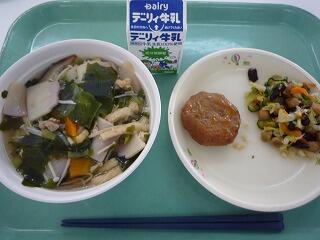 わかめうどん 鶏つくね 豆の和風サラダ 牛乳