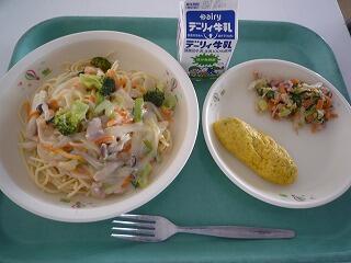クリームスパゲティ トマトオムレツ 青じそサラダ 牛乳