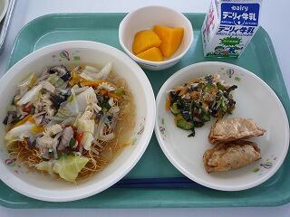 皿うどん 揚げ餃子 わかめサラダ 宮崎マンゴー 牛乳