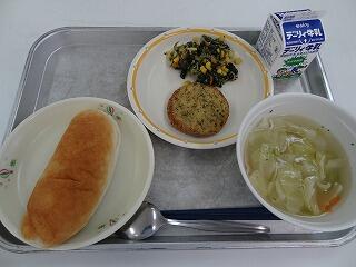 米粉パン 牛乳 大豆と豆腐のフライ ほうれん草サラダ 野菜スープ