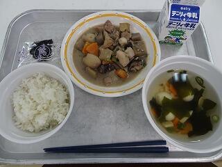 麦ご飯 牛乳 鶏と里いものみそ煮 マロニースープ