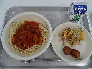 スパゲティトマトソース 牛乳 鶏つくね コーンサラダ
