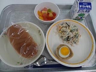 黒糖パン 牛乳 スコッチエッグ 千切り大根のサラダ フルーツカクテル