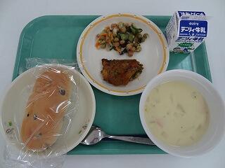 レーズンパン 牛乳 タンドリーチキン 豆の和風サラダ コーンポタージュスープ