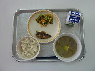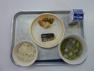 麦ご飯 さんま梅煮 ごま和え じゃがいものみそ汁 牛乳