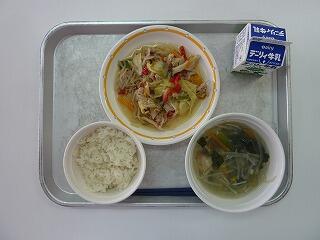 麦ご飯 豚の生姜炒め 春雨スープ 牛乳