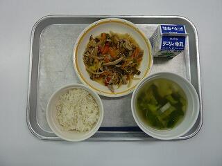 麦ご飯 牛乳 豚と野菜のオイスター炒め 中華スープ