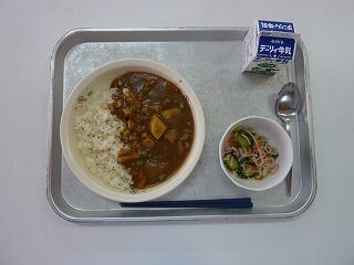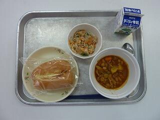 ドライカレー ハムサラダ かぼちゃスープ 牛乳