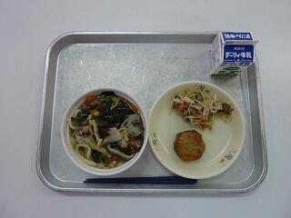 わかめうどん 平つくね おかか和え 牛乳