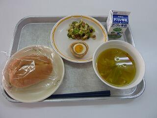 マヨネーズパン 牛乳 スコッチエッグ 豆サラダ 野菜スープ