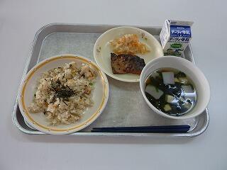 炊き込みご飯 牛乳 白身魚のフライ 酢の物 ニラ玉スープ プリン