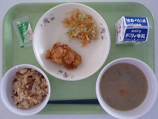 ひむか炊き込みご飯 チキン南蛮 添え野菜 なめこ汁 牛乳