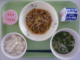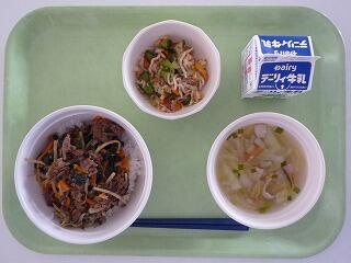 ビビンバ丼 おかか和え 白菜スープ 牛乳