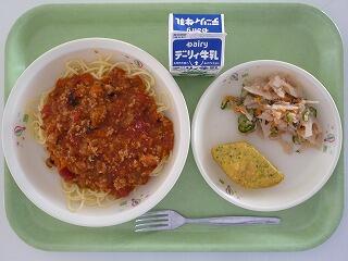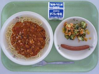 ミートソーススパゲティ ウインナー ブロッコリーのサラダ 牛乳