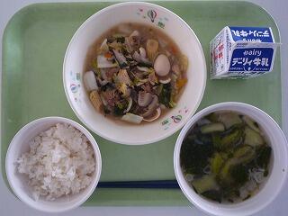 麦ご飯 八宝菜 ワンタンスープ 牛乳