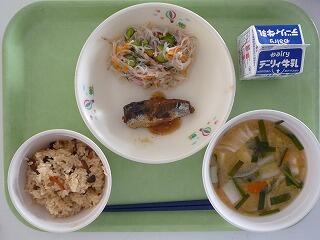 きのこご飯 いわしみぞれ煮 春雨の酢の物 キムチ汁 牛乳