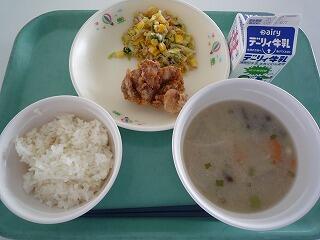 麦ご飯 鶏の唐揚げ コーンサラダ なめこ汁 牛乳