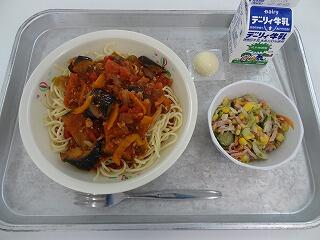なすのミートソーススパゲティ 牛乳 コーンサラダ 型抜きチーズ(サッカー)