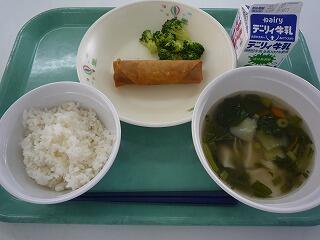 麦ご飯 春巻き ゆでブロッコリー 餃子スープ 牛乳