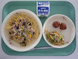 和風きのこスパゲティ 鶏つくね 青じそサラダ 牛乳
