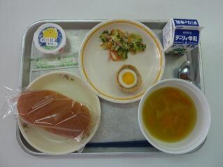 ミルクパン スコッチエッグ コールスローサラダ コーンスープ 牛乳 お月見ゼリー