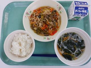 麦ご飯 豚と野菜の黒酢炒め 汁ビーフン 牛乳