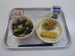 わかめうどん 牛乳 切り干し大根の厚焼き卵 ごま和え リンゴタルト