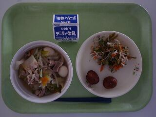 五目うどん 肉だんご 茎わかめの酢の物 牛乳